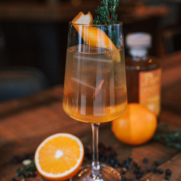 In einem hohen Glas auf Eis servieren. Als Garnitur Schale einer unbehandelten Orange und einen Zweig Thymian dazu geben.